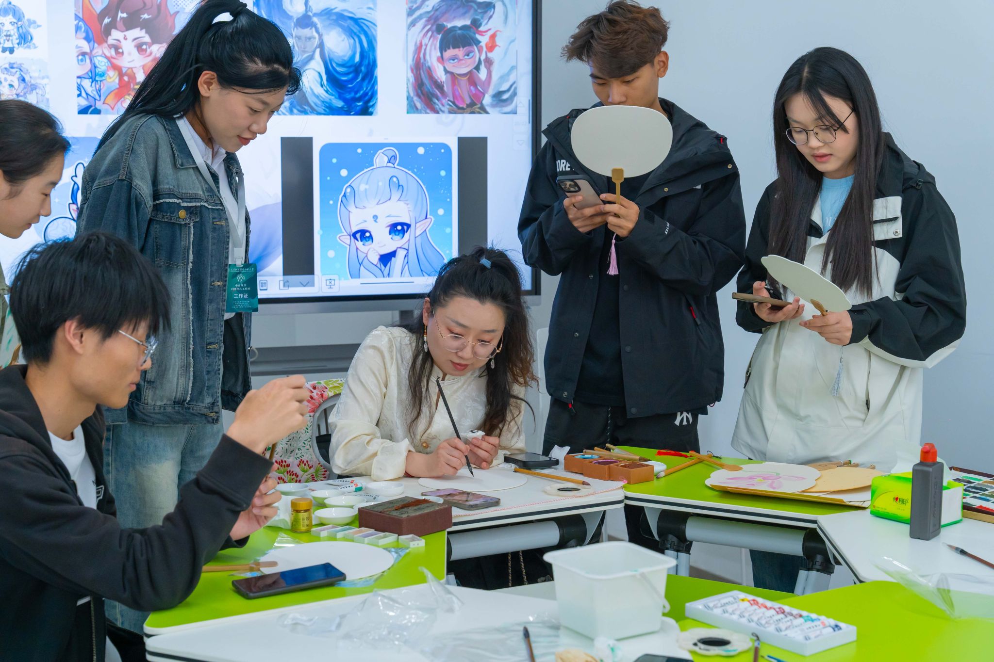 举动伊初,袁林身着华夏保守衣饰,以脚中画便的纨扇为媒,指导同砚们穿梭千年时间,道述纨扇启载的“团聚和睦”“浑正刚直”文明外延。从《簪花仕女图》《步辇图》中的“障扇”应用代价,再到唐宋书生骚人笔停的图画俗趣战当停前卫影戏《哪吒2》中“尔命由尔没有由天”的宏放志气,将汗青文脉取今世青年代价不雅培养美妙协调。正在理论步骤,袁林现场树模古板矿物颜色分配技法,求教教死利用碰色、留黑等邦绘古代画绘本领正在纨扇上独创,让青竹凌霜、白梅映雪等意象跃然扇里。现场同砚援笔勾画间,既领悟了“疏影横斜火浑浅”的西方好教意境,更领悟到非遗武艺中蕴藏的匠心肉体。
